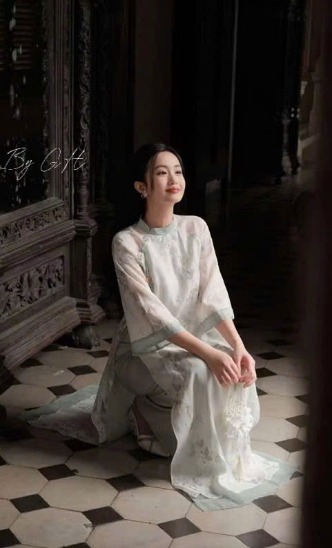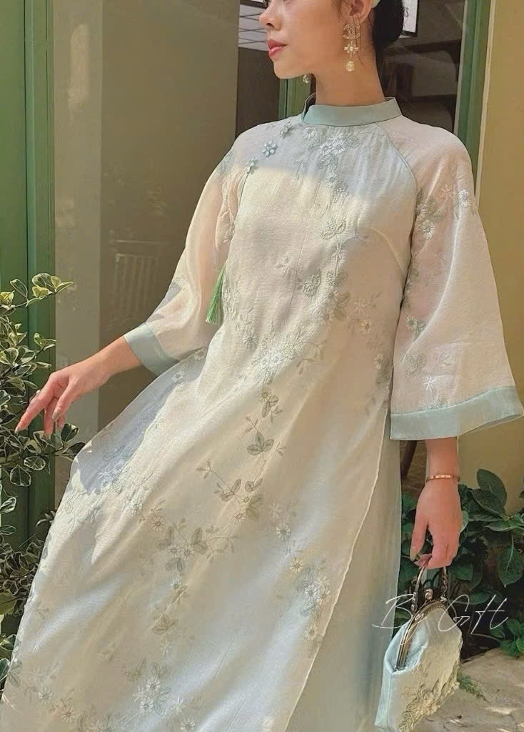 Áo dài voan tơ thêu xanh ngọc