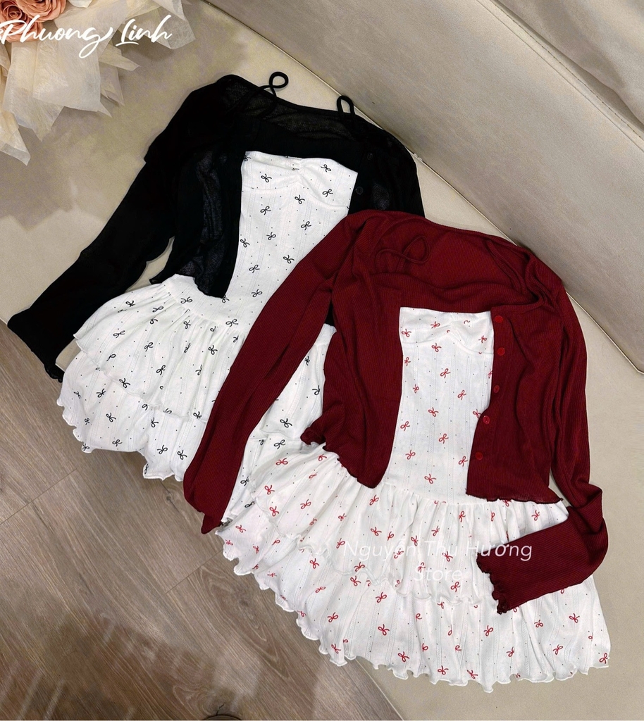 Đầm 2 dây tầng nơ bảng ngực kèm khoác