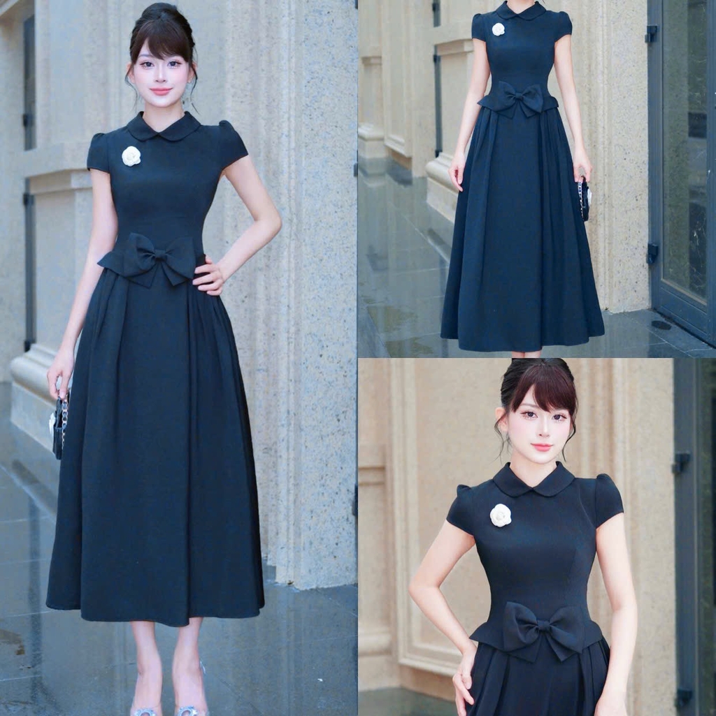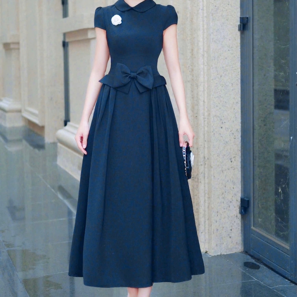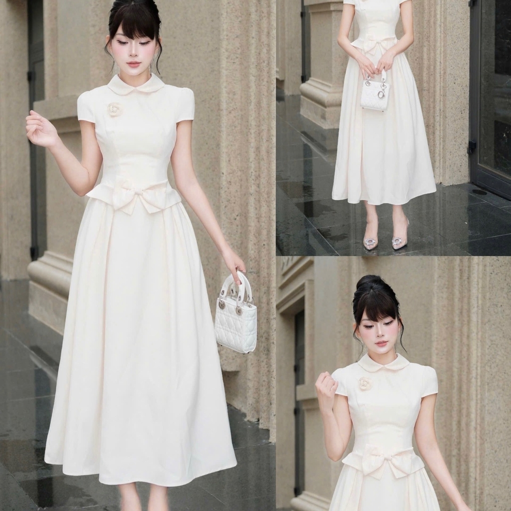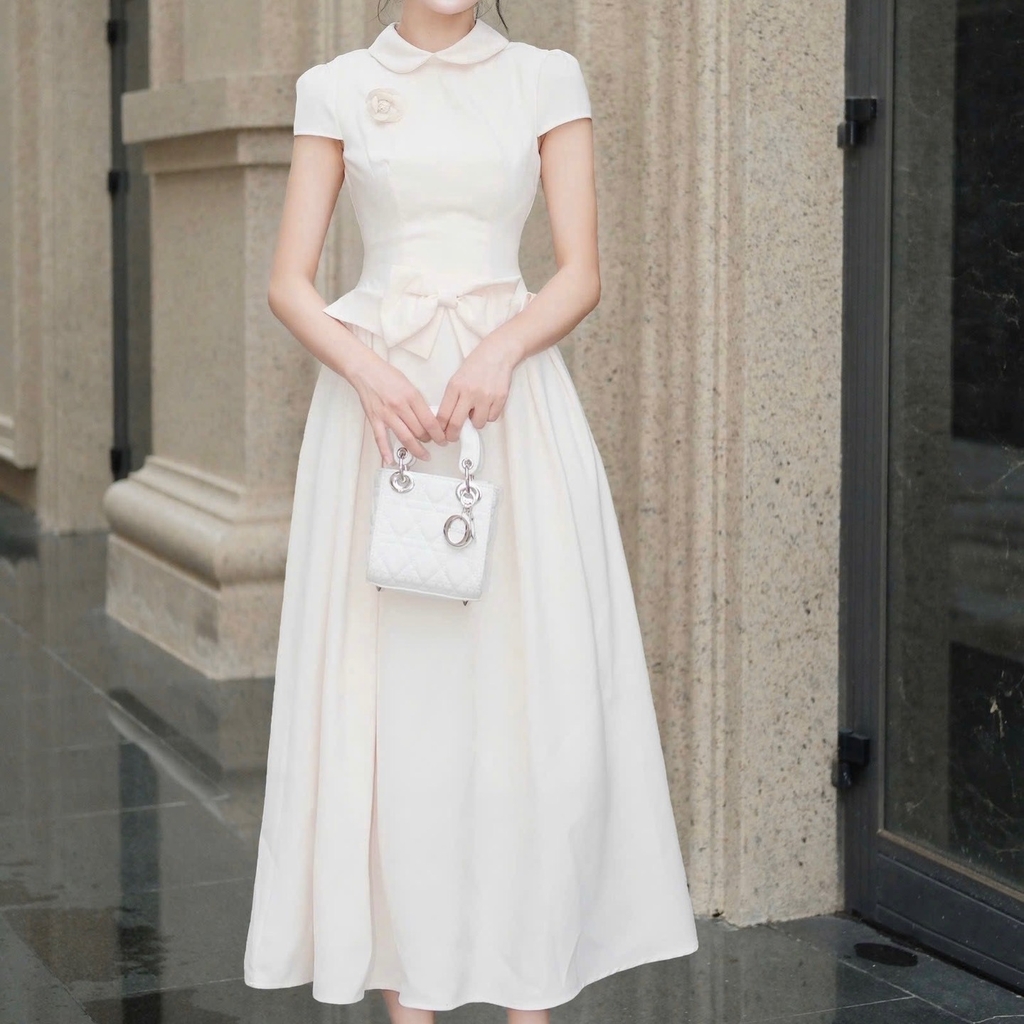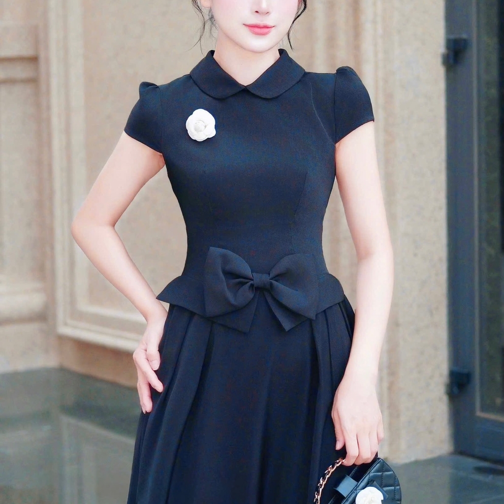 Đầm thiết kế cổ tròn nơ dáng A xoè ngắn