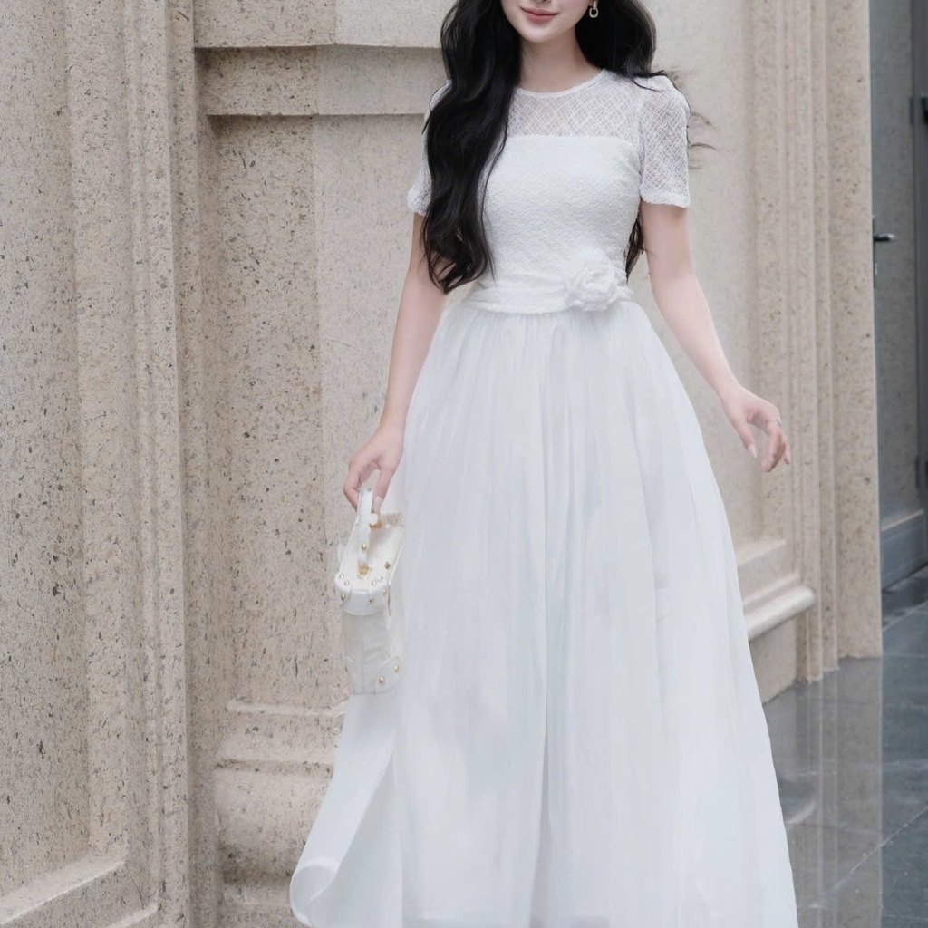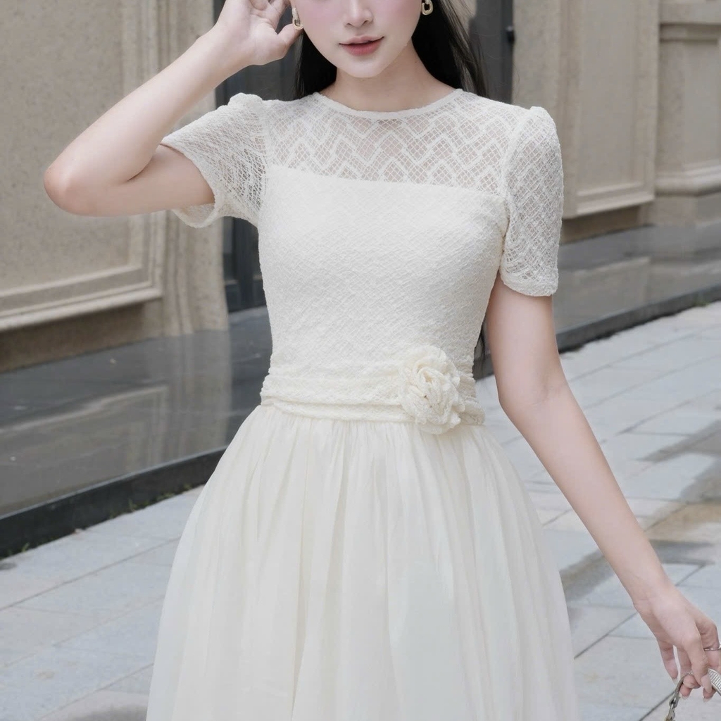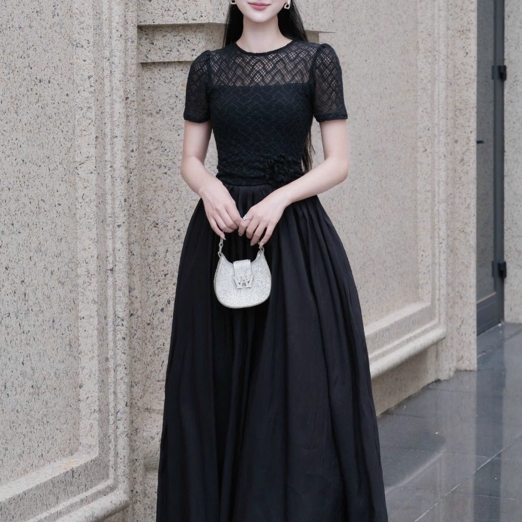 Đầm cổ tròn phối ren dáng dài xoè cao cấp tay ngắn đi tiệc 3 màu kem/ trắng/đen