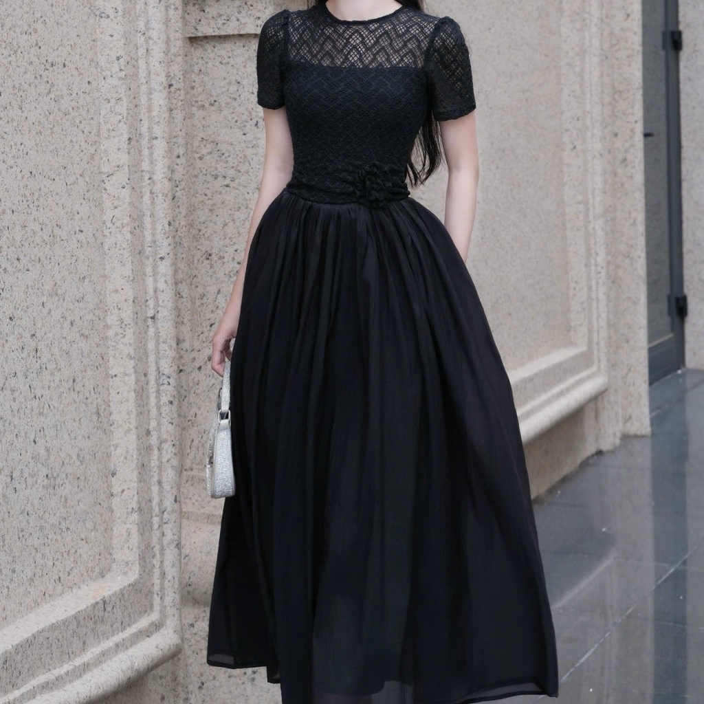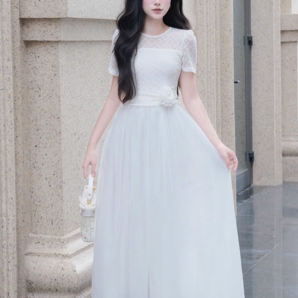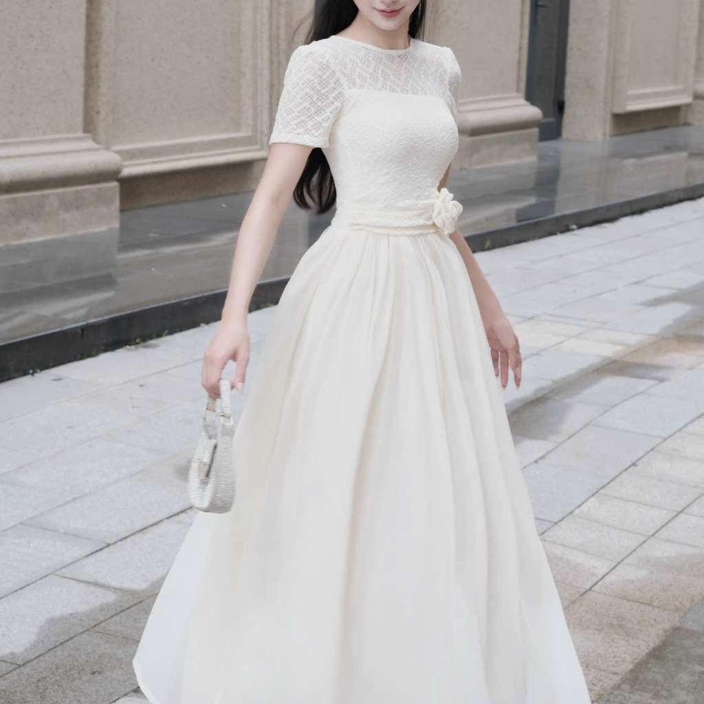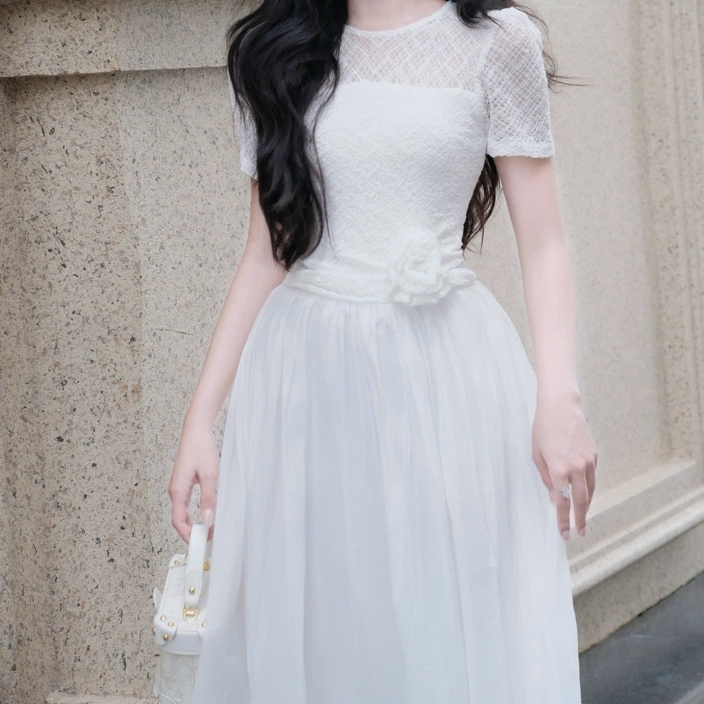 Đầm cổ tròn phối ren dáng dài xoè cao cấp tay ngắn đi tiệc 3 màu kem/ trắng/đen
