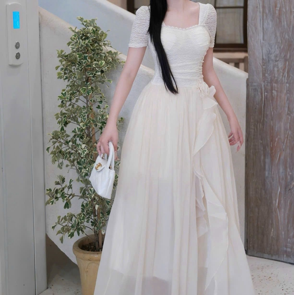 Đầm cổ vuông dáng dài viền ngọc tay ngắn phối ren đầm dài phồng thiết kế sang chảnh đi tiệc
