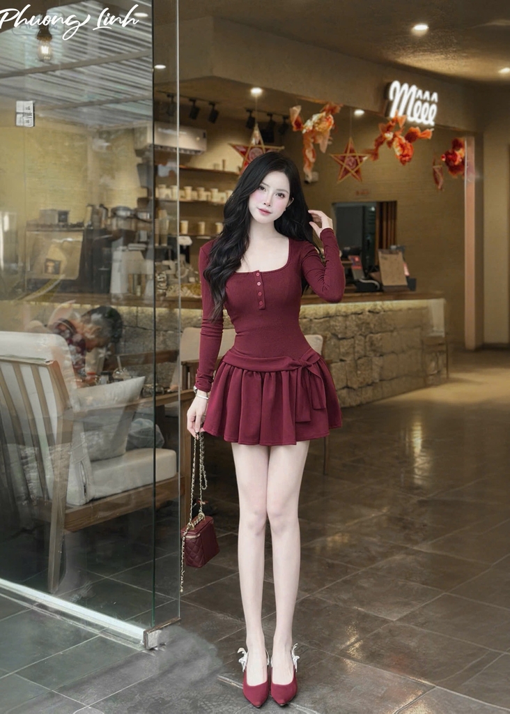 Đầm thiết kế tay dài lưới dáng xoè khoét ngực sang chảnh