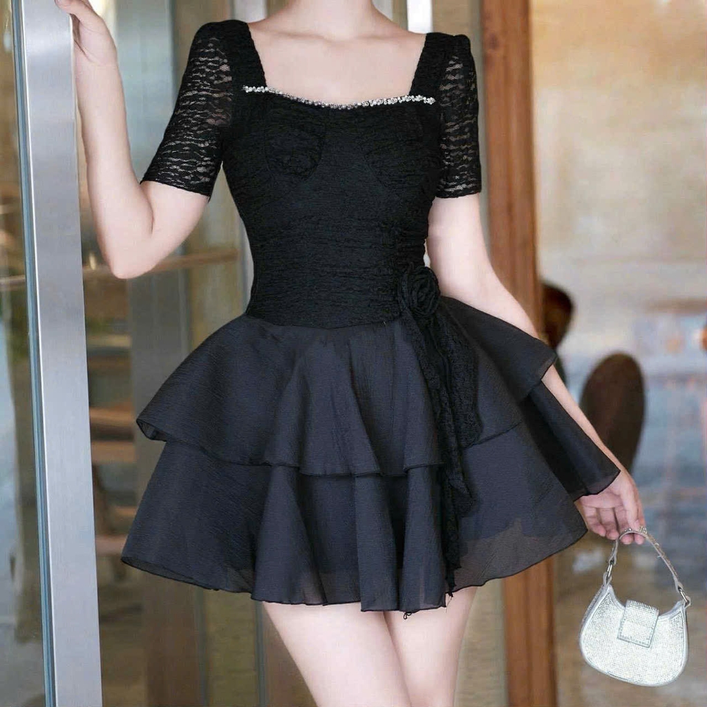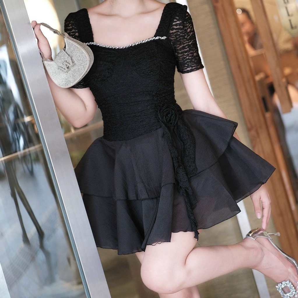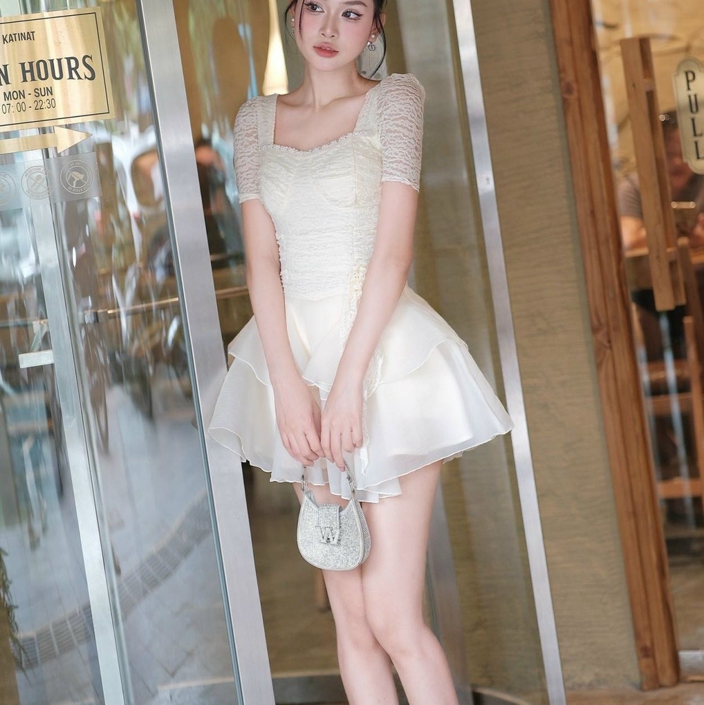 Đầm cổ vuông viền ngọc ren ngắn tay ngắn phối ren 2 tầng voan đi tiệc