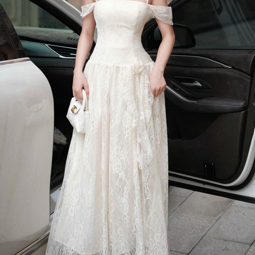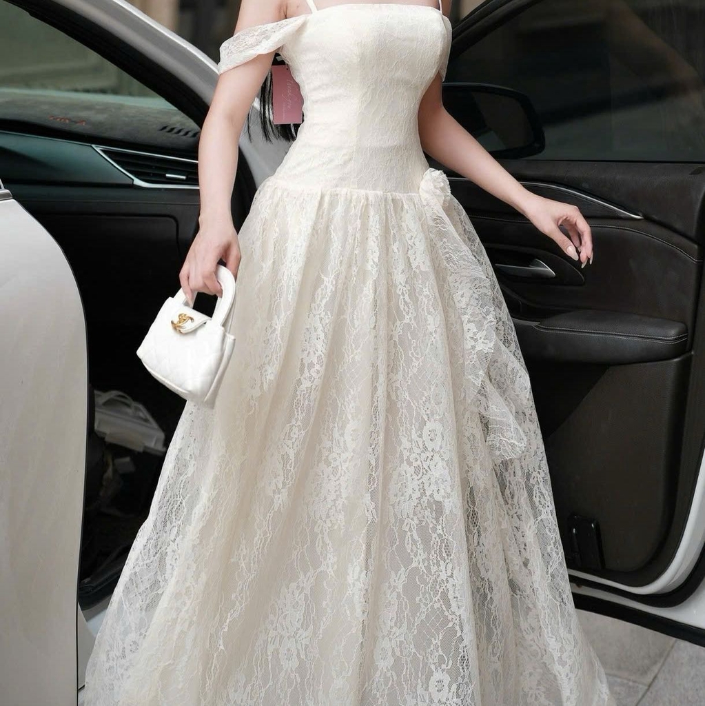 Đầm dây rớt vai trễ vai dáng dài xoè sang trọng đi tiệc thiết kế cao cấp màu kem/ trắng