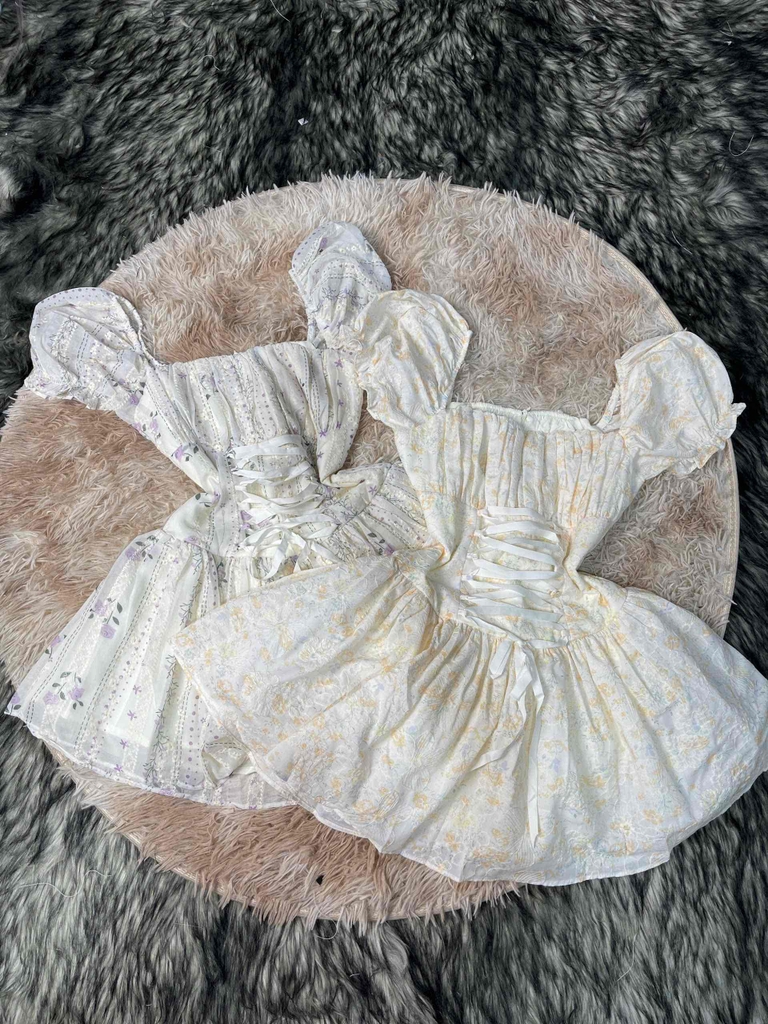 Đầm ngắn cổ bèo hoa nhí đan eo lớn