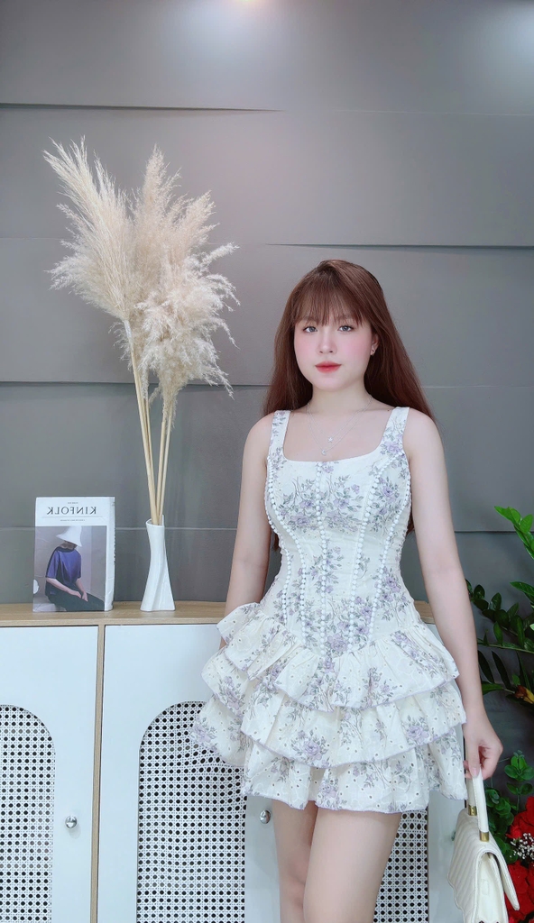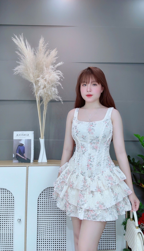 Đầm ngắn cổ vuông 3 tầng hoa nhí 5 sọc dọc