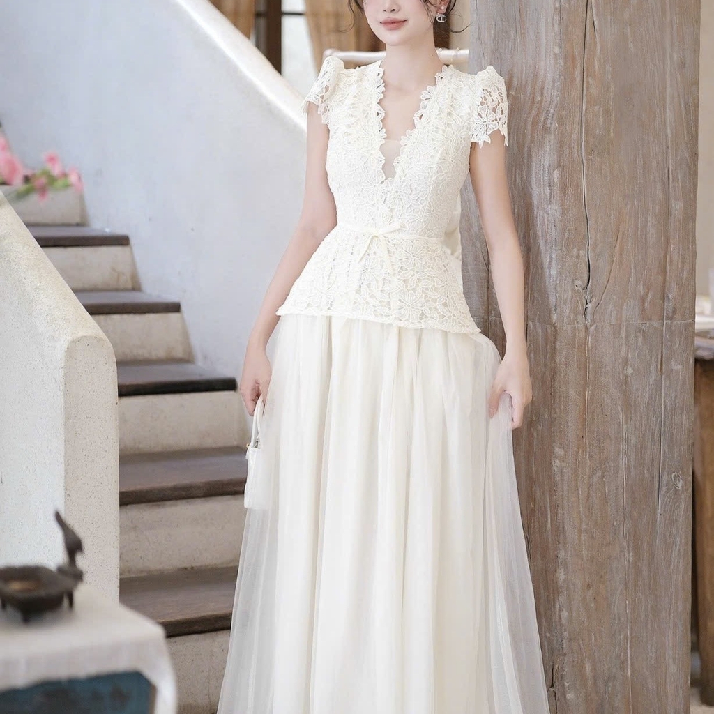 Đầm phối ren cổ V cổ tim tay ren dáng dài cao cấp thiết kế đi tiệc sang trọng