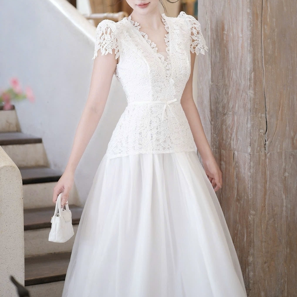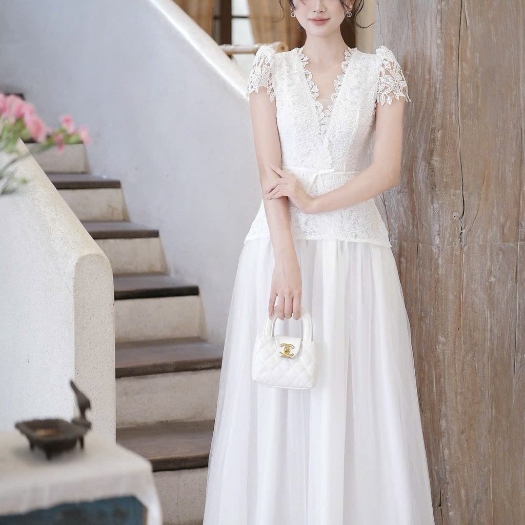Đầm phối ren cổ V cổ tim tay ren dáng dài xèo cao cấp thiết kế đi tiệc sang trọng
