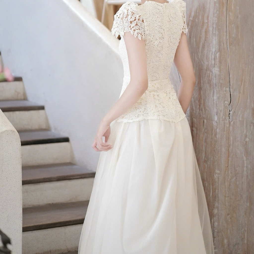 Đầm ngắn chữ A cổ sen ren trẻ trung thiết kế