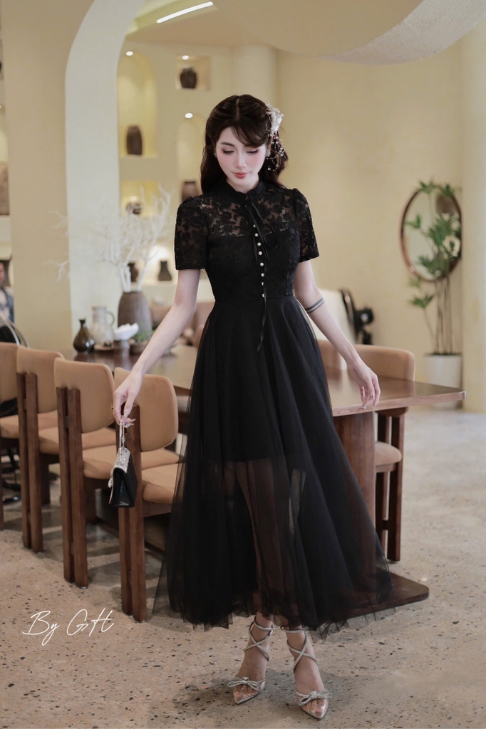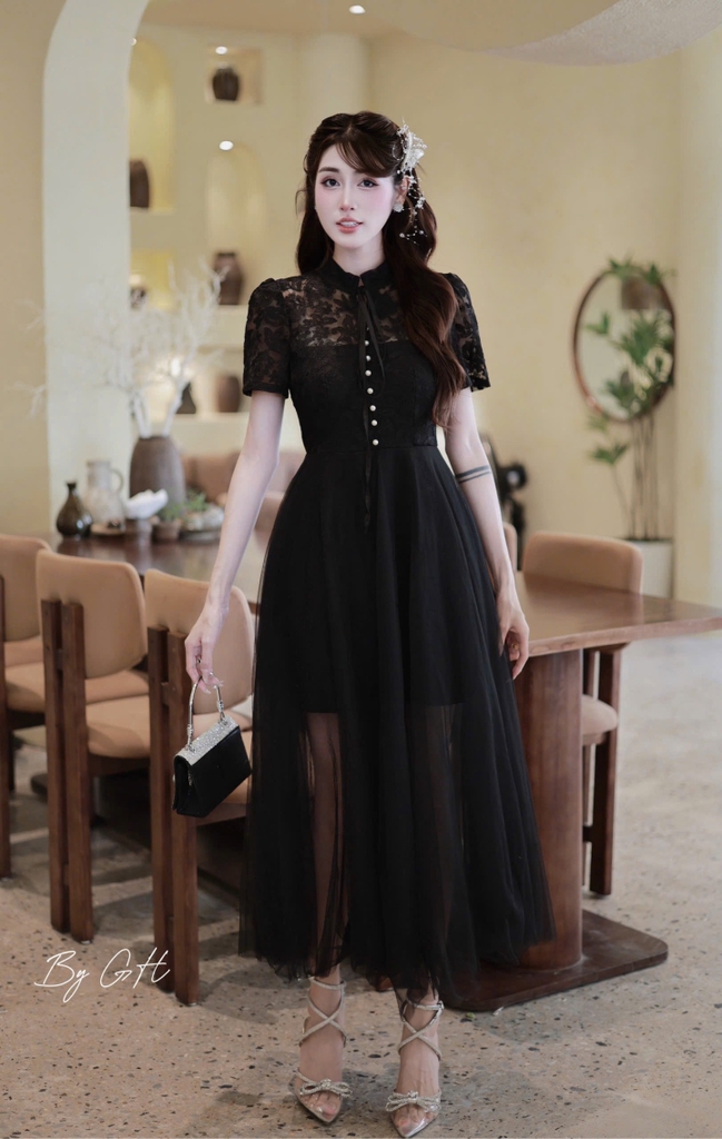 Đầm cổ ngọc đính tay bồng dáng xoè H