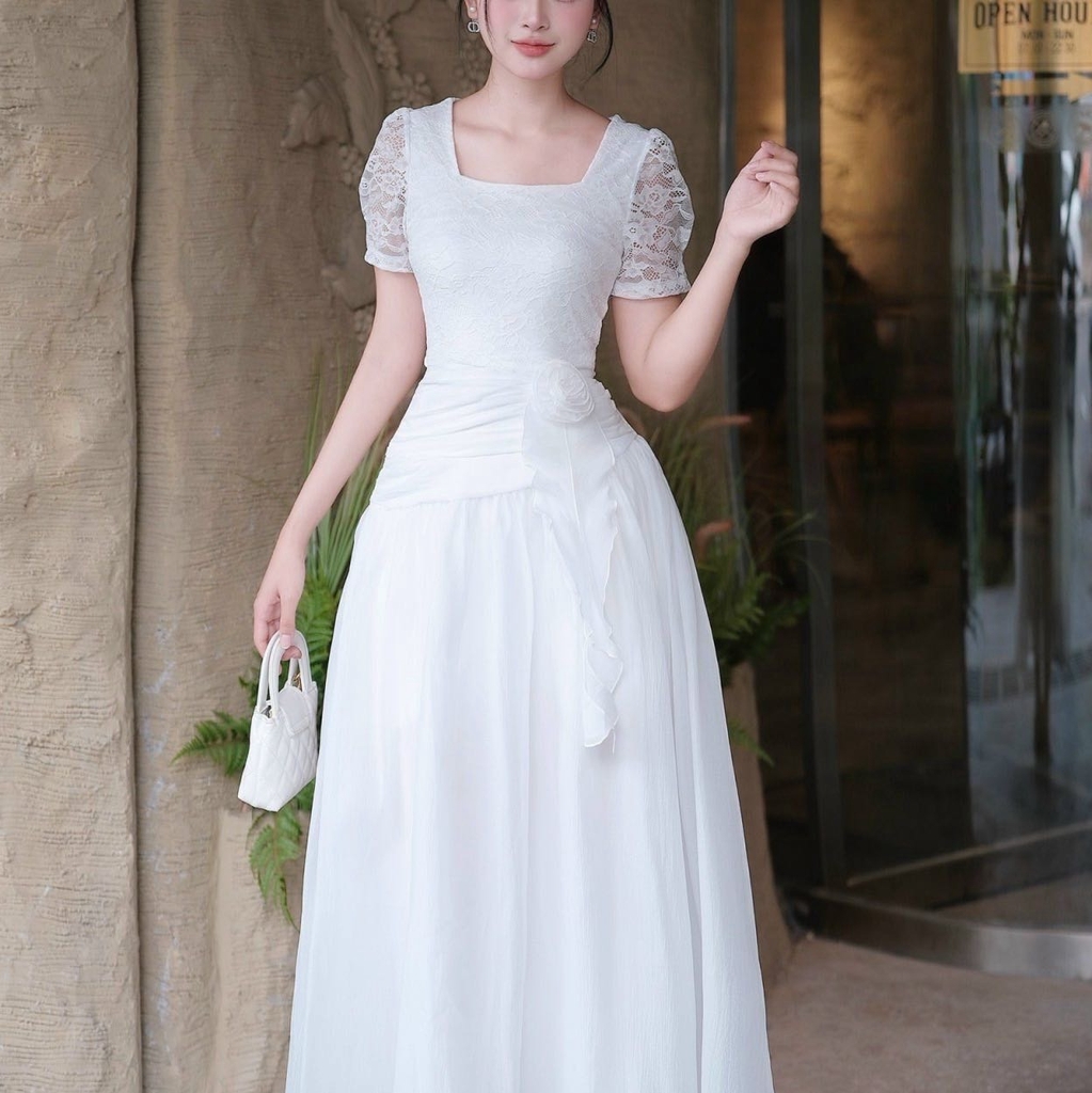 Đầm tay ngắn bồng phối ren dáng dài phối hoa cao cấp đi tiệc sang chảnh