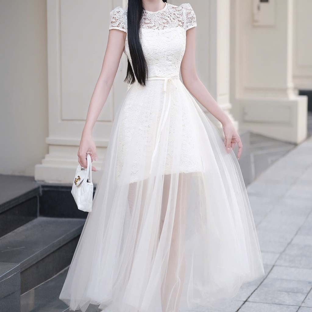 Đầm tay ren phối ngực ren dáng dài đơn giản thanh lịch chân voan cao cấp thiết kế đi tiệc