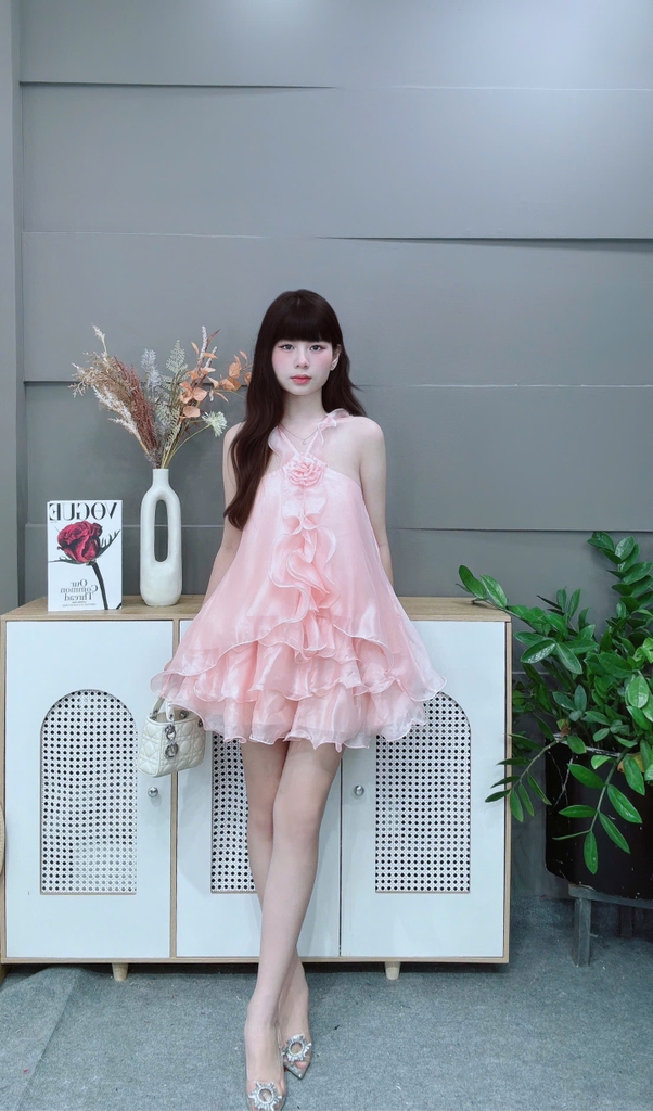 Váy cổ vuông 2 tầng tay bồng xếp li