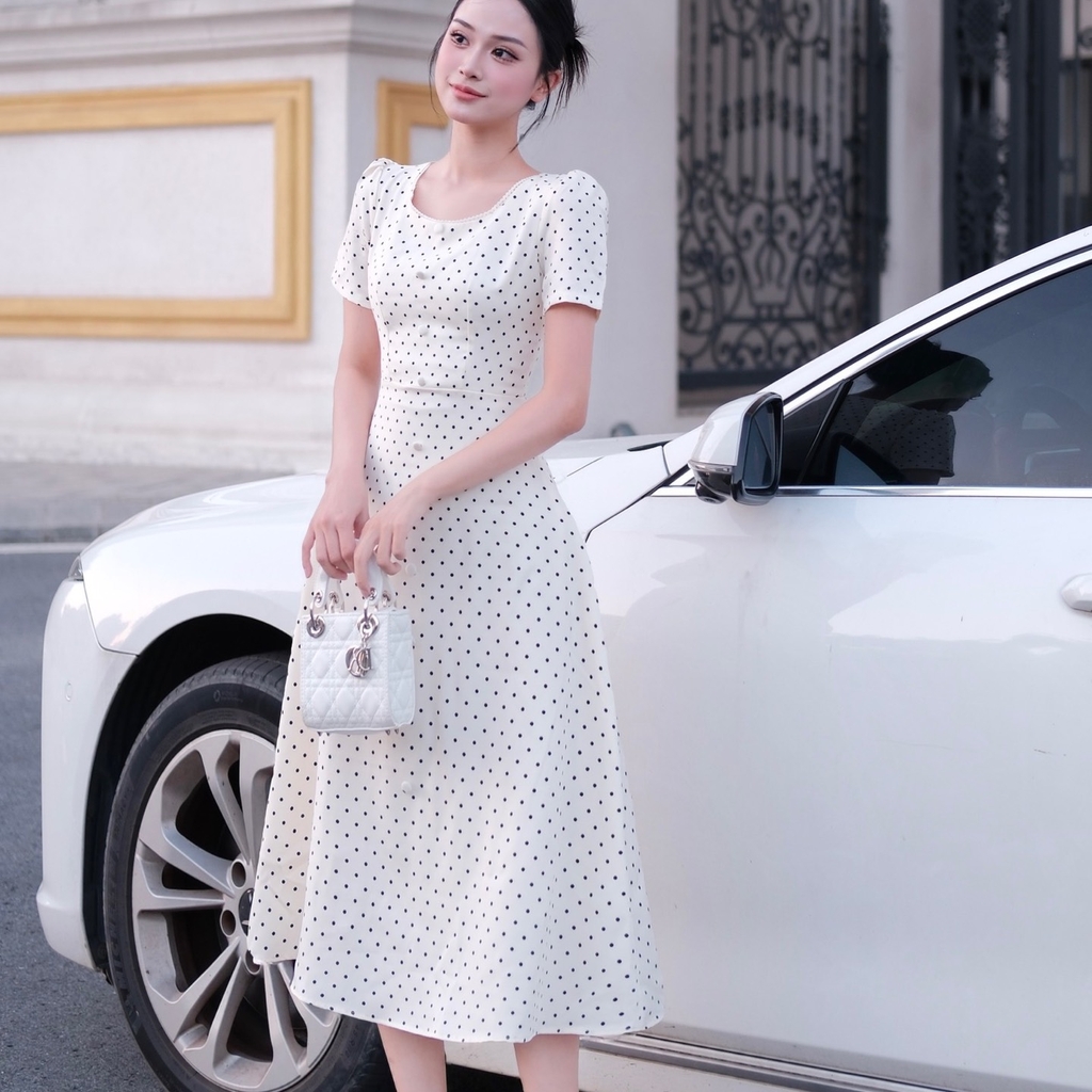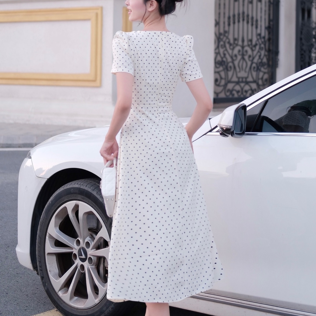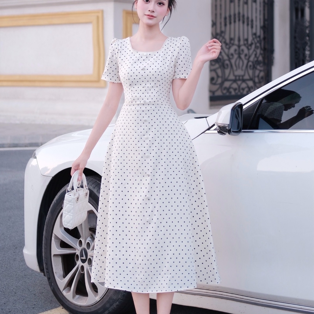 Đầm thiết kế chấm bi đen trắng cổ vuông dáng dài xoè nhẹ sang trọng đi tiệc