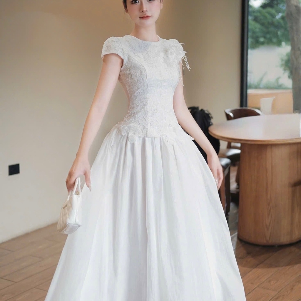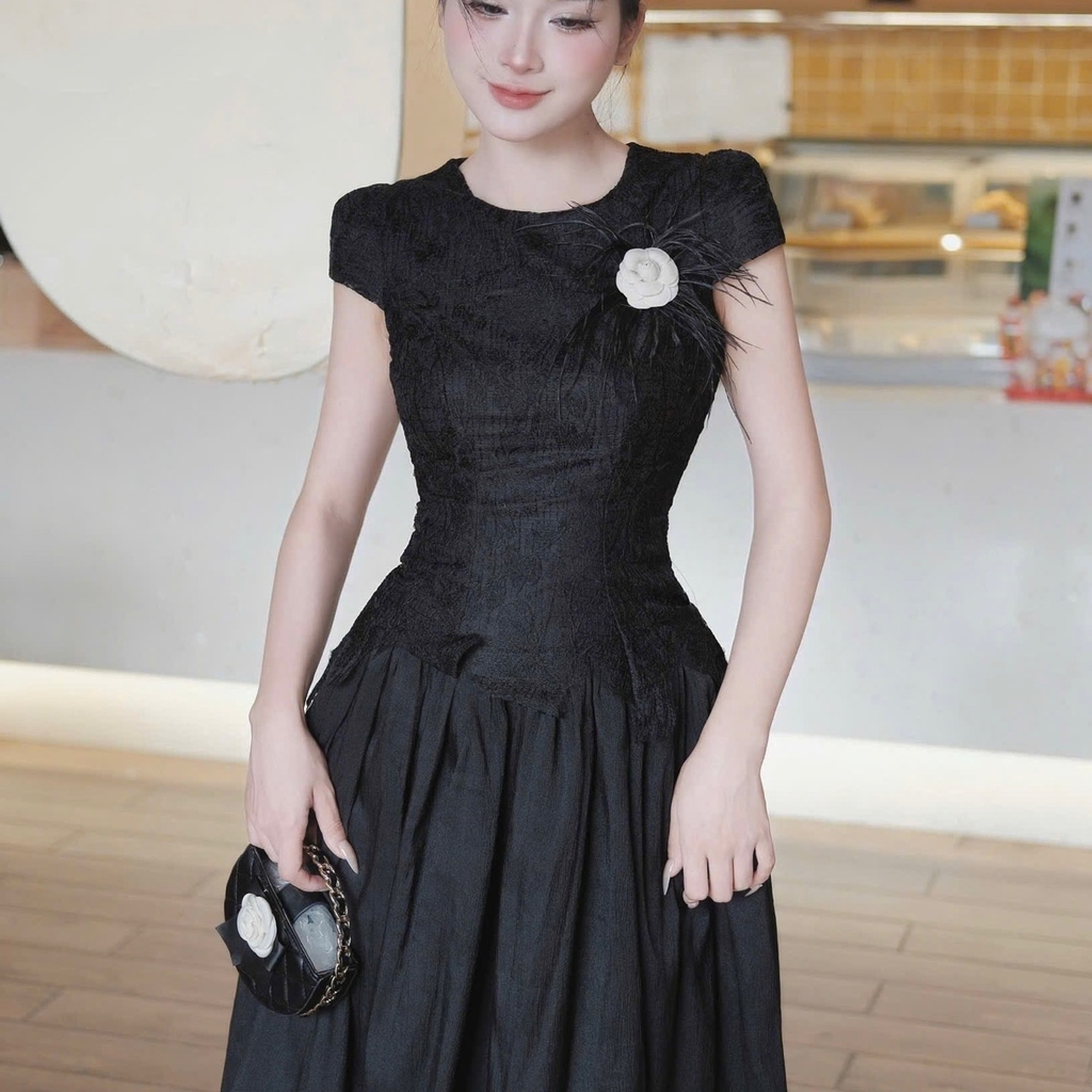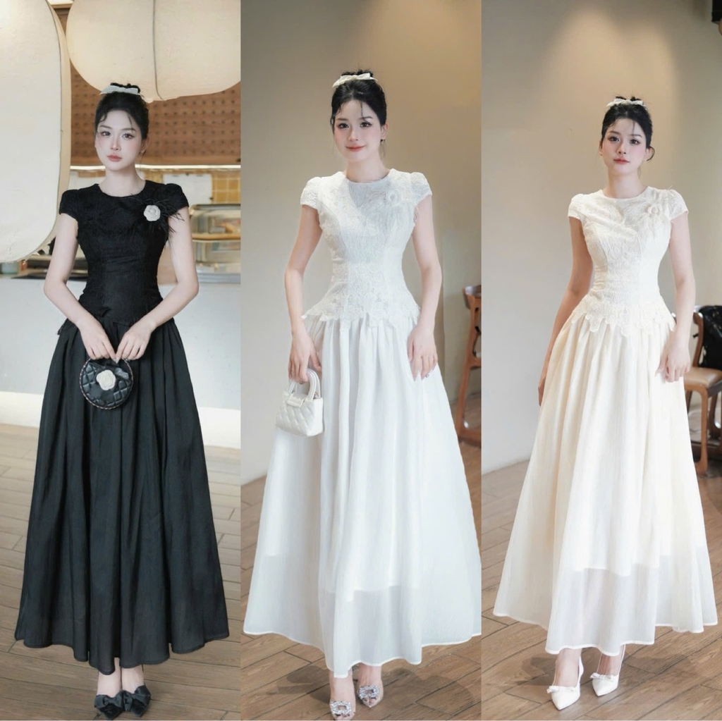 Đầm thiết kế chất ren cổ tròn phối chân tơ tặng hoa 3 màu đen kem trắng