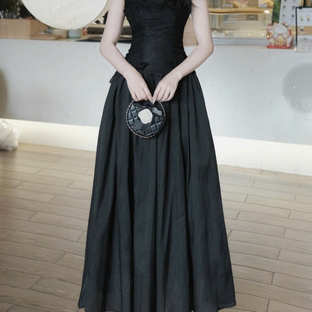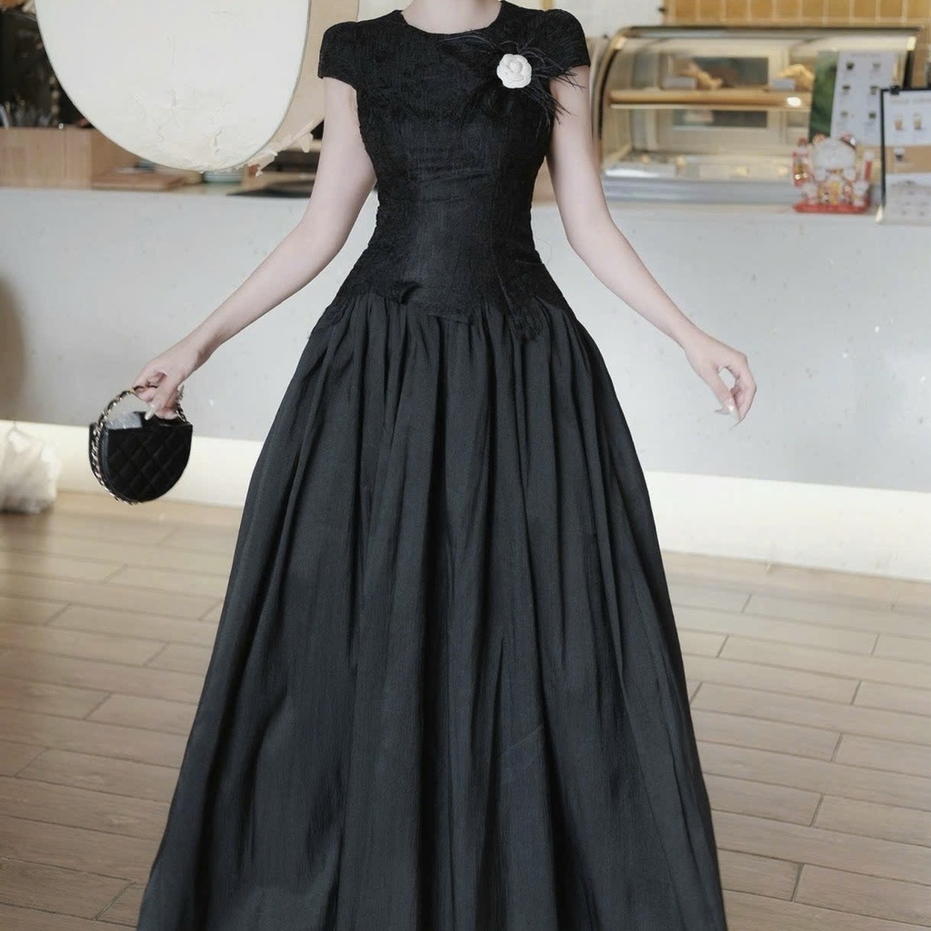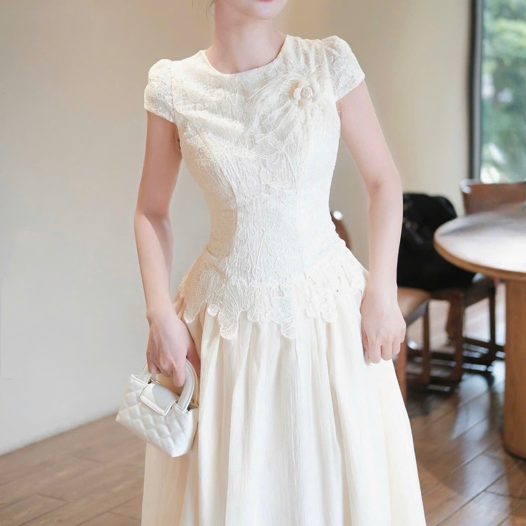 Đầm thiết kế chất ren cổ tròn phối chân tơ tặng hoa 3 màu đen kem trắng