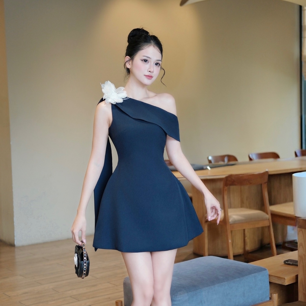 Đầm thiết kế chéo vai trễ vai dáng ngắn chữ A kèm hoa