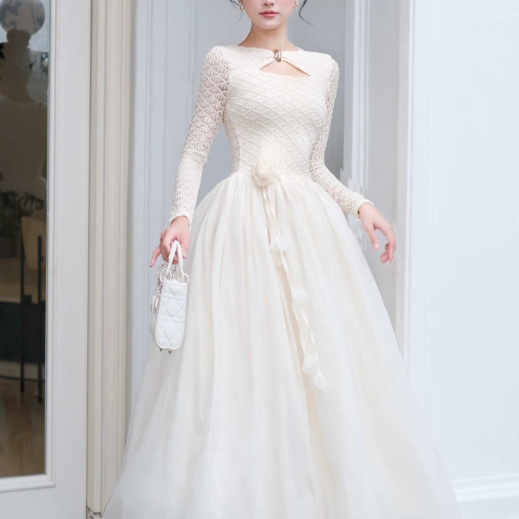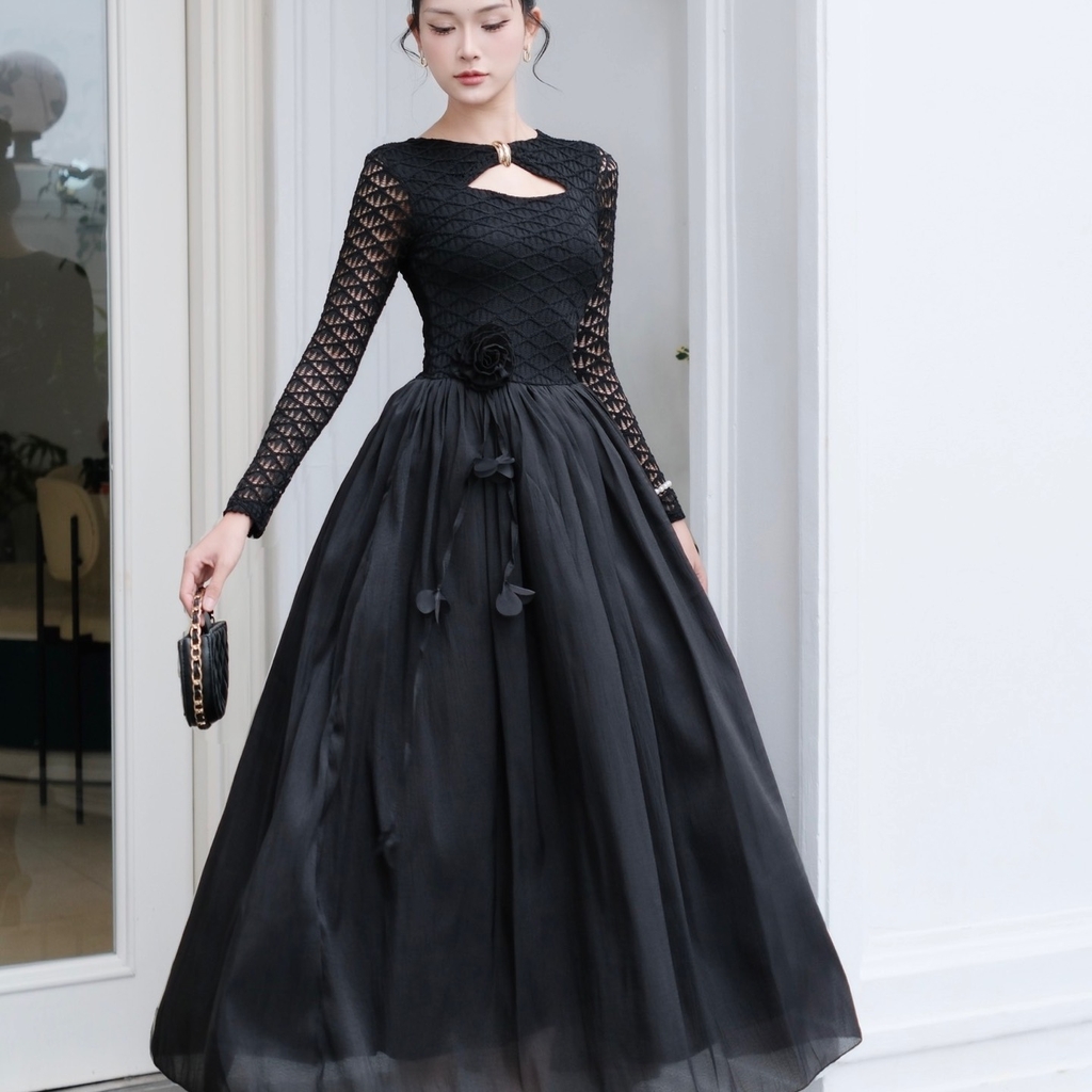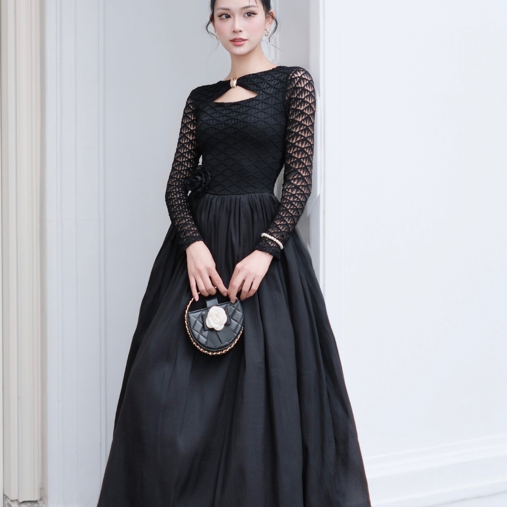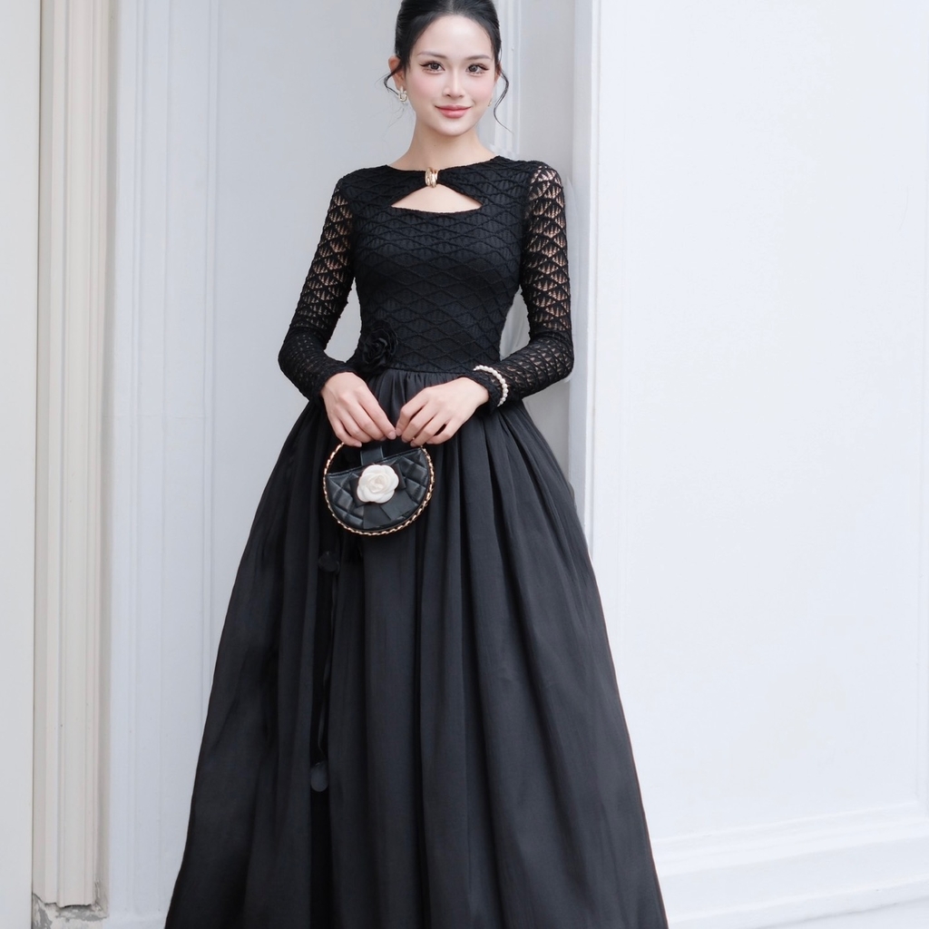 Đầm thiết kế tay dài lưới dáng xoè khoét ngực sang chảnh