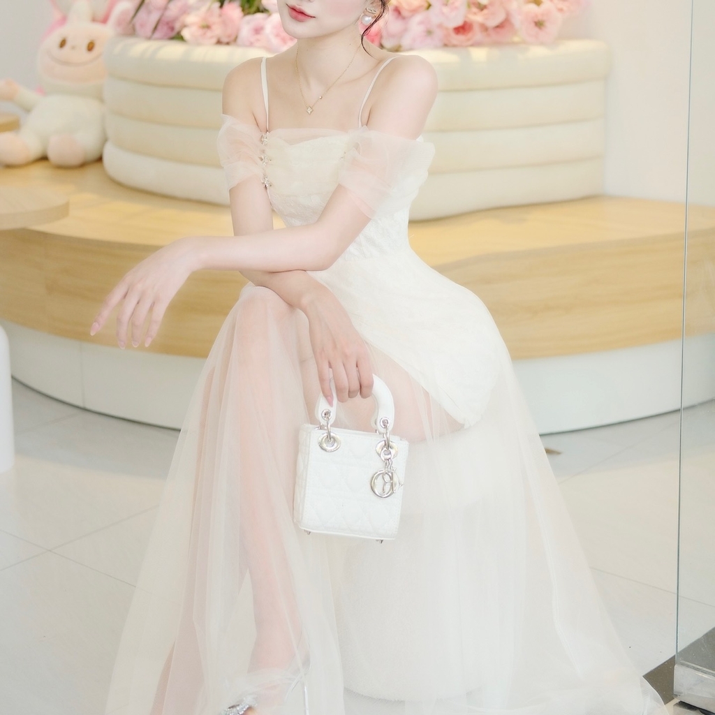 Đầm thiết kế trễ vai dáng dài phối voan chữ A sang trọng đi tiệc