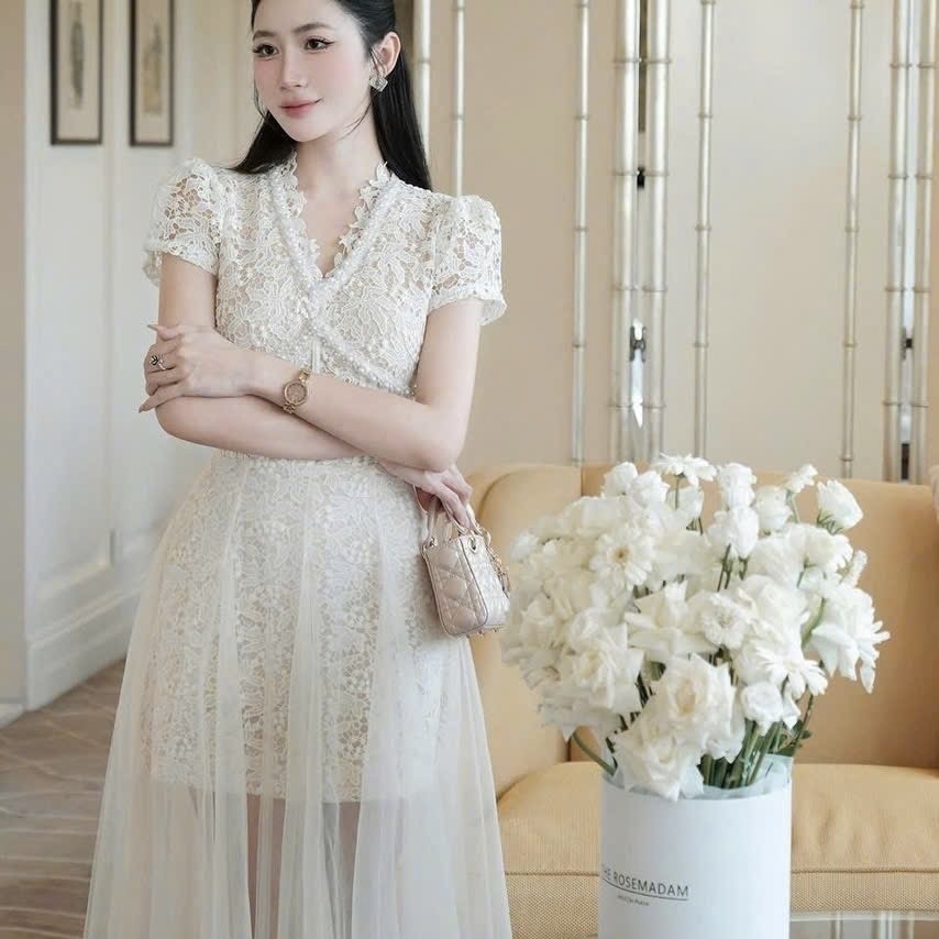 Đầm thiết kết đi tiệc cổ V ren viền ngọc ngực phối voan