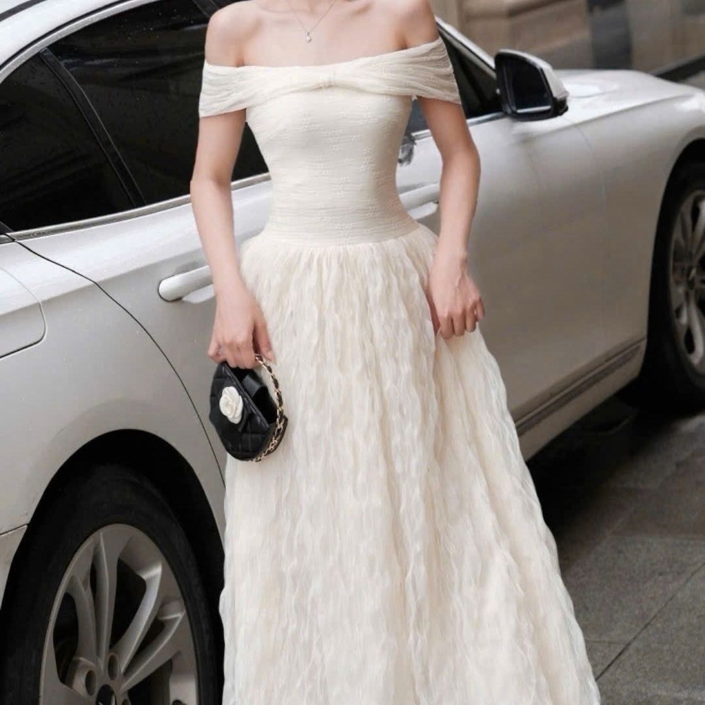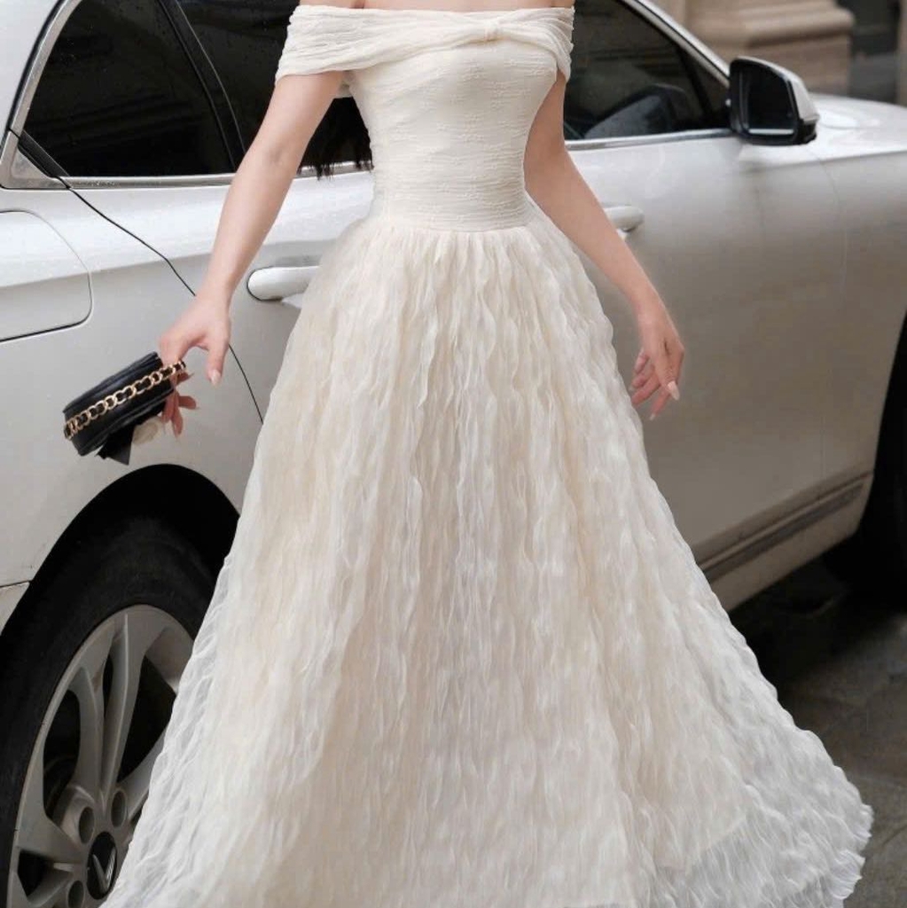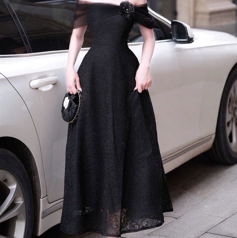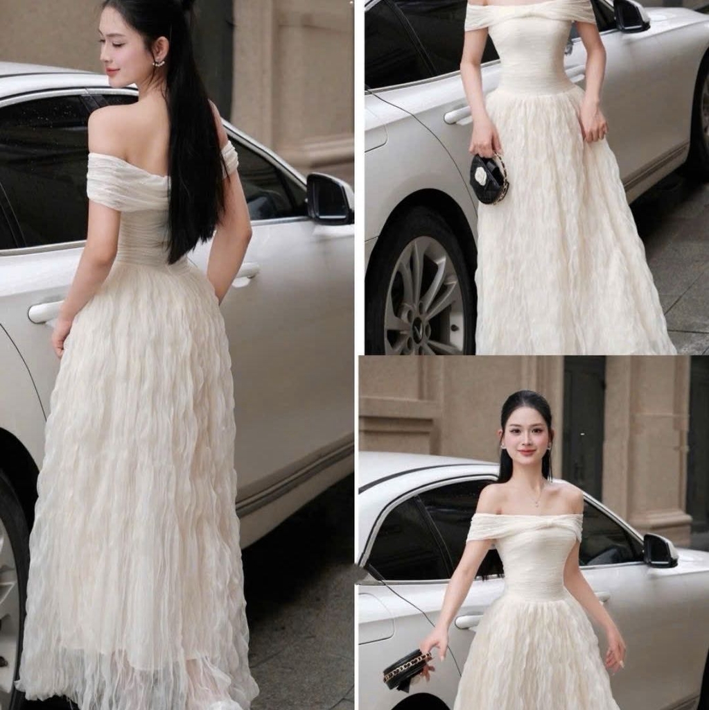 Đầm trễ vai nơ ôm ngực đi tiệc dáng dài cao cấp phối voan xoăn sang chảnh