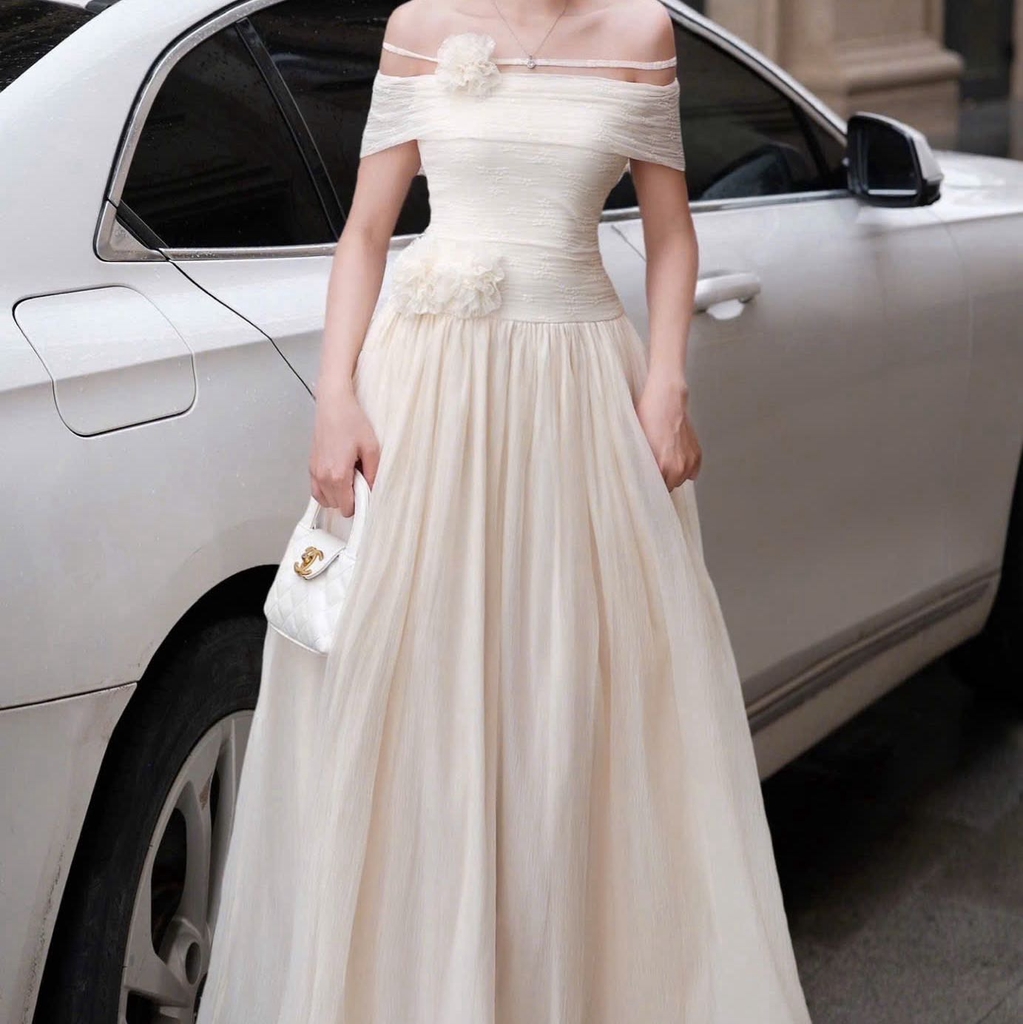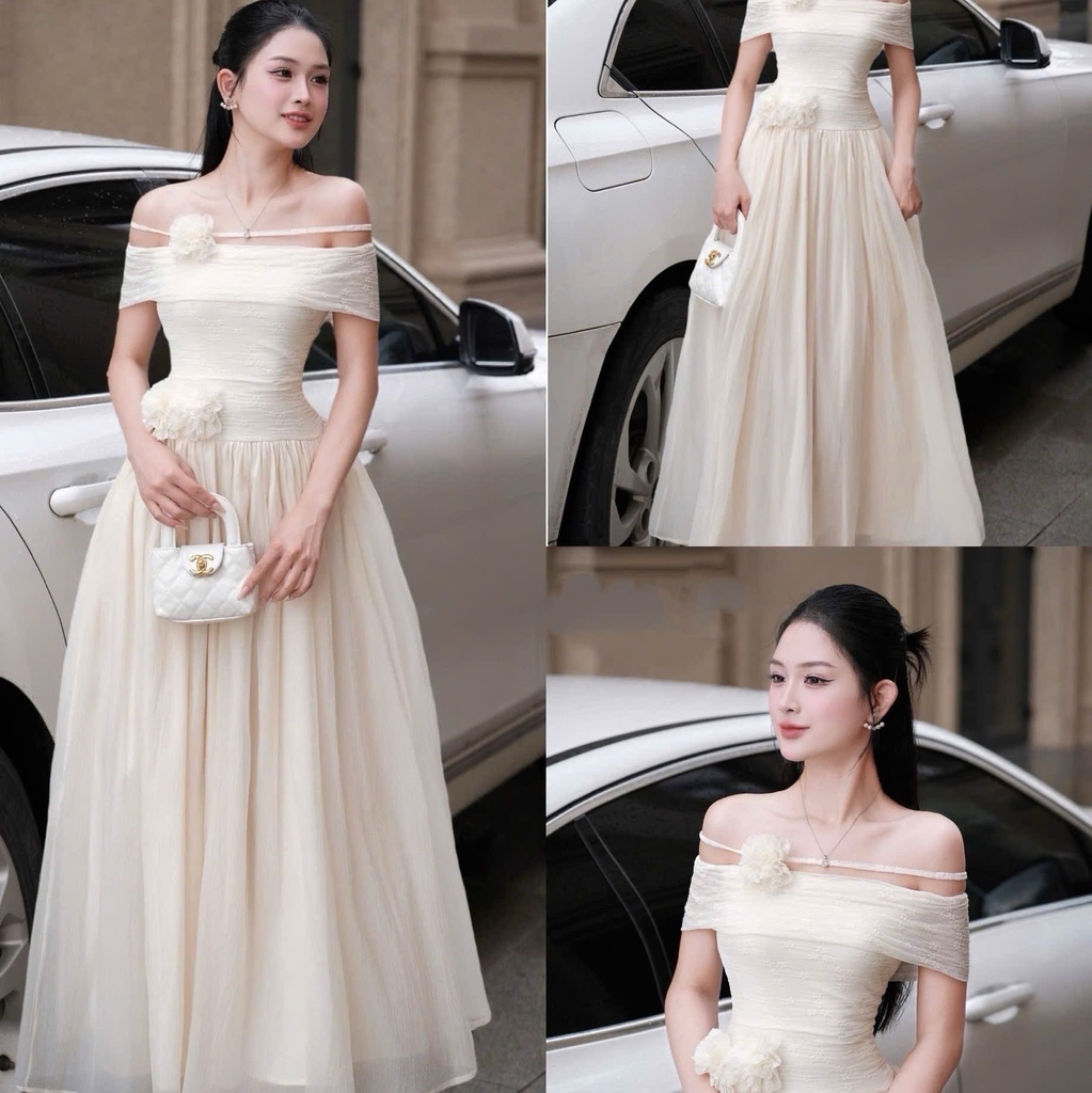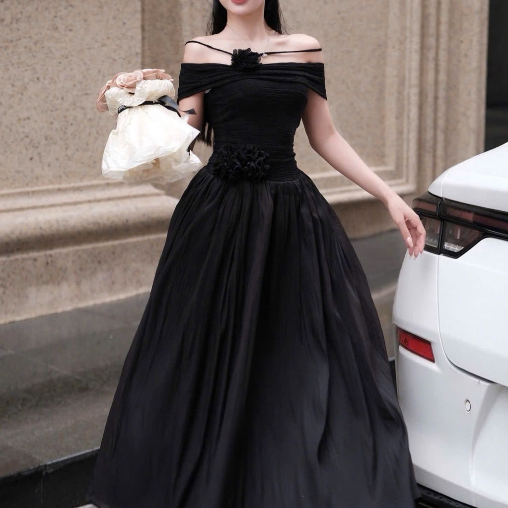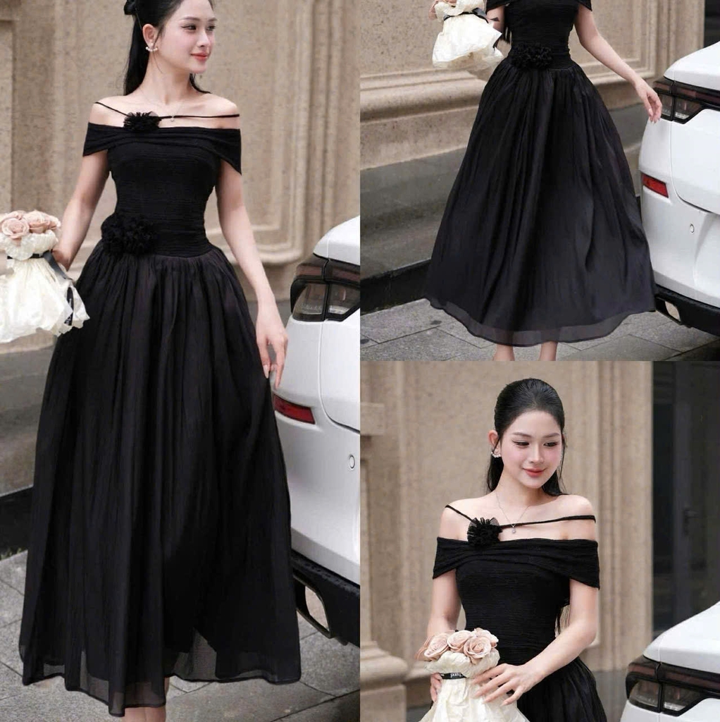 Đầm trễ vai ôm ngực dáng dài xòe sang chảnh đi tiệc thiết kế tay ngắn hai màu đen/trắng
