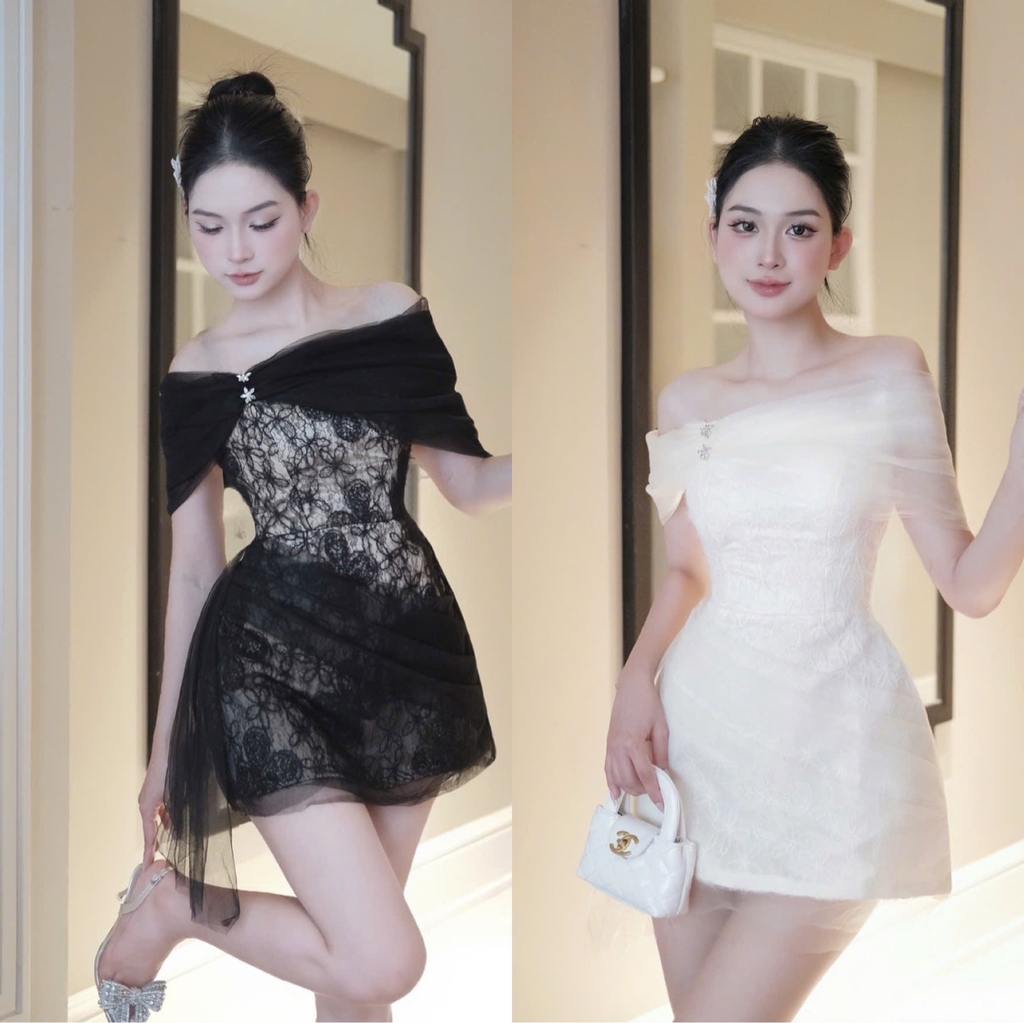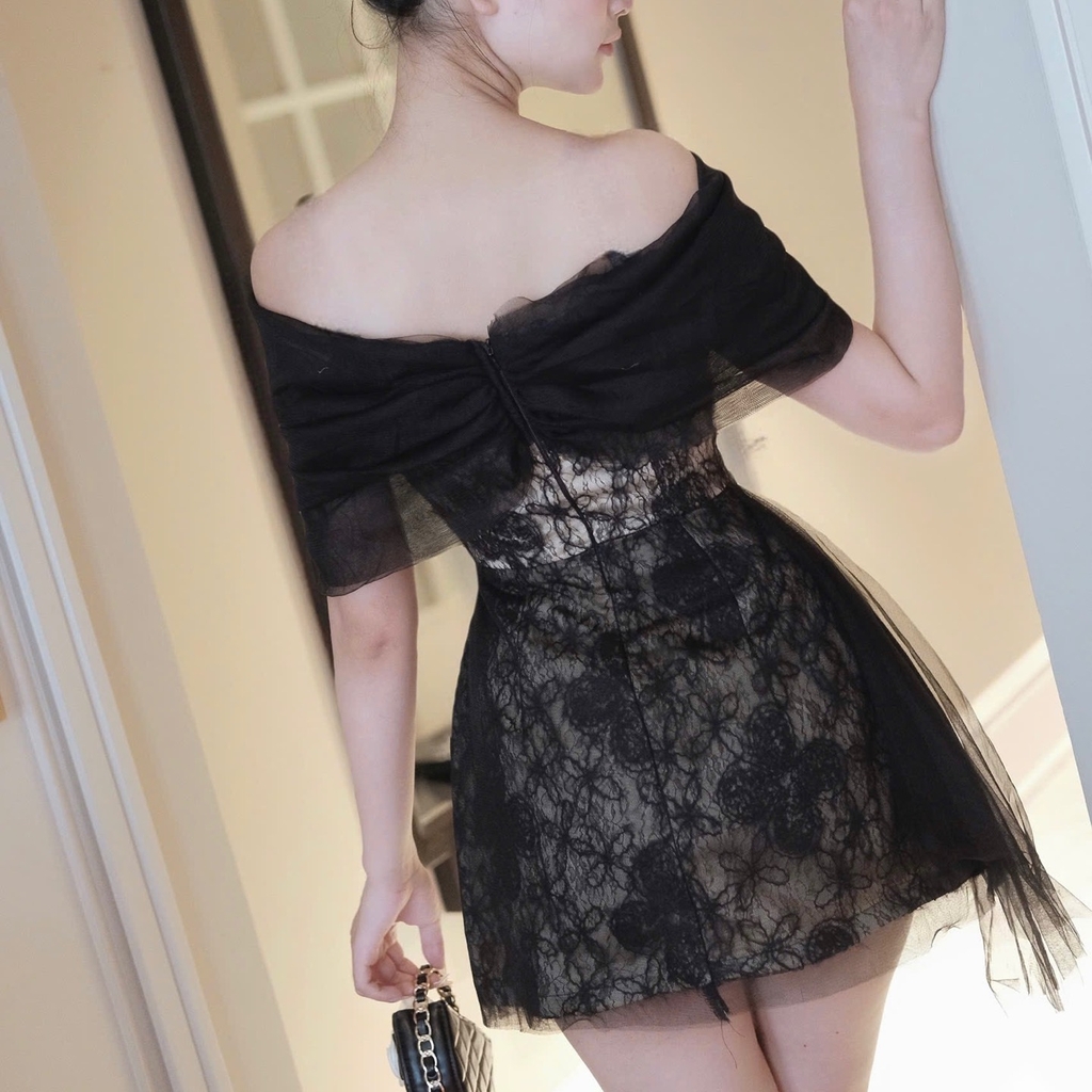 Đầm trễ vai phối voan chữ A phối ren lông