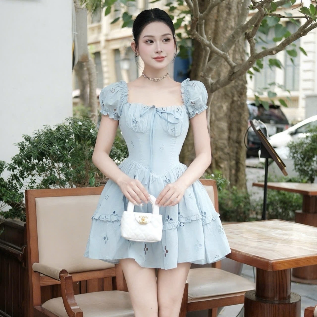 Đầm vải tay nhúng cổ vuông xoè nhẹ 2 tầng dáng ngắn ôm ngực 2 màu xanh biển / kem