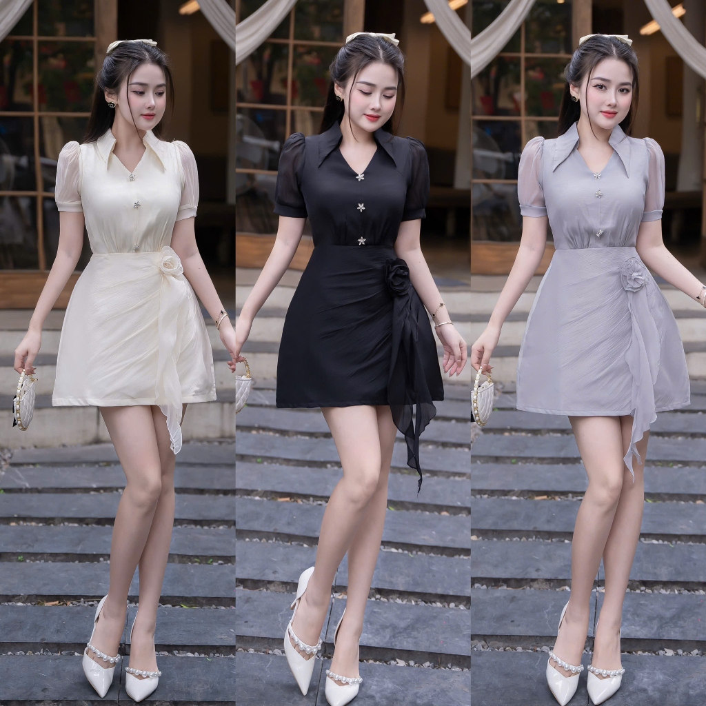 Đầm voan cổ sơ mi kín đáo thanh lịch phối váy A đi tiệc cao cấp 3 màu xanh/đen/kem