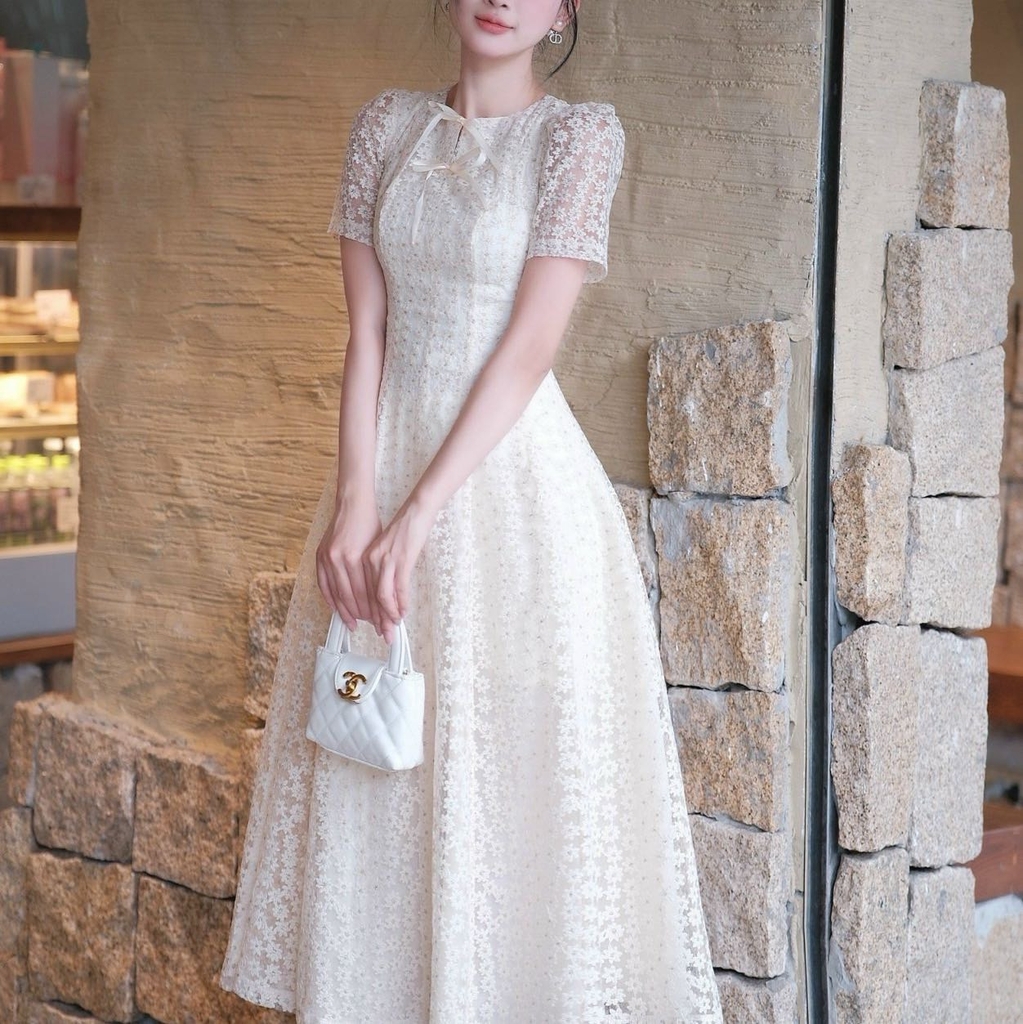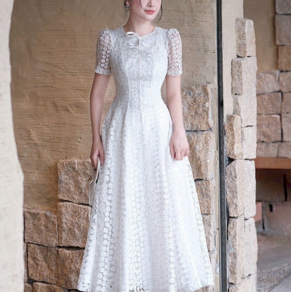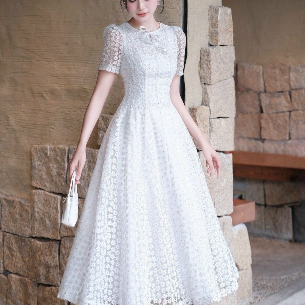 Đầm voan hoa cổ tròn tay ngắn công chúa sang trọng dáng xòe cao cấp đi tiệc