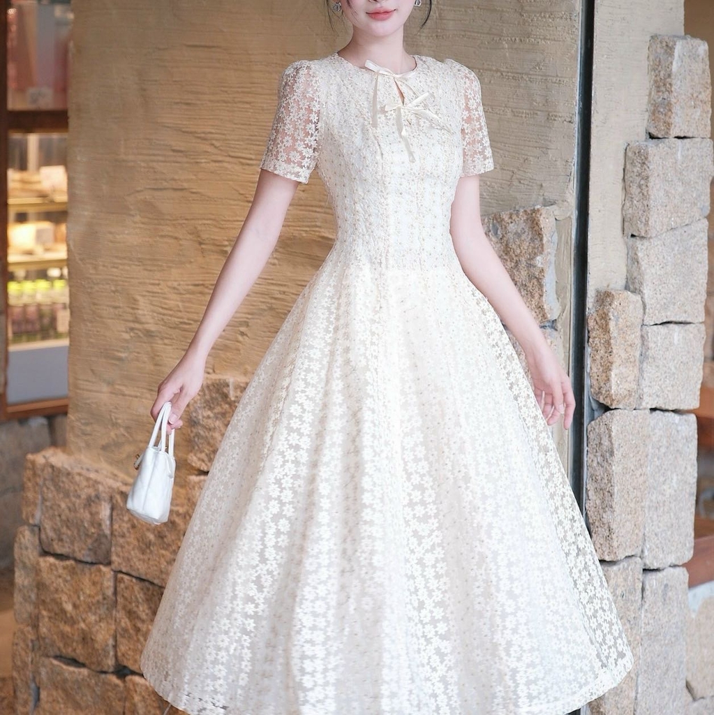Đầm thiết kế cổ tròn nơ dáng A xoè ngắn